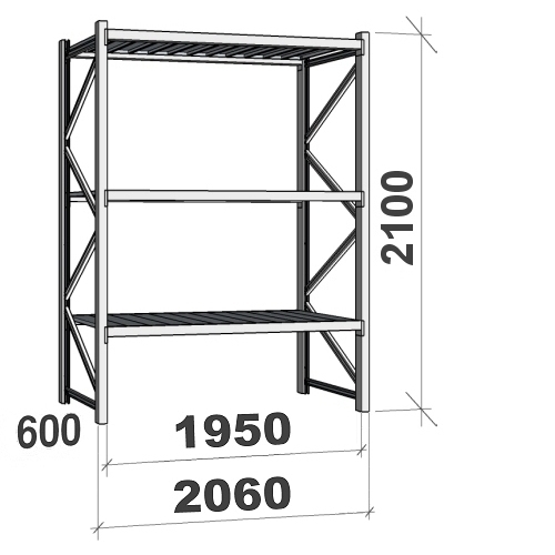 Varastohylly perusosa 2100x1950x600 440kg/hyllytaso,3 tasoa peltitasoilla MAXI