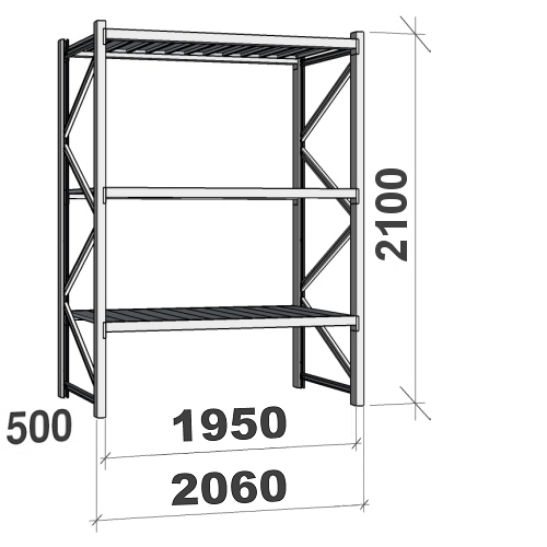 Metallihylly perusosa 2100x1950x500 440kg/taso,3 tasoa lastulevytasoilla MAXI