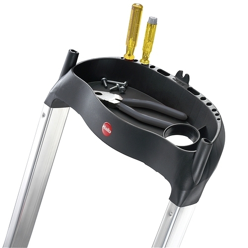 - Rihlatut askelmat, korkea polvituki ja kestävä työkalukotelo sekä luja saranointi lisäävät turvallisuutta.