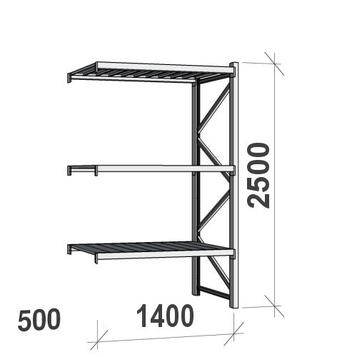 Varastohylly jatko-osa 2500x1400x500 600kg/hyllytaso,3 tasoa peltitasoilla