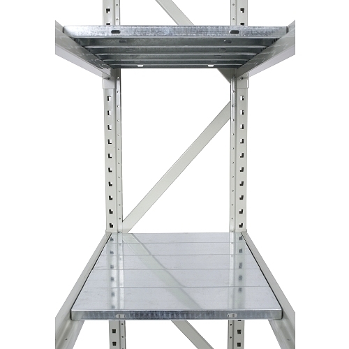 - A shelf level consists of 2 horizontal beams, beam locking clips and 15 levels made of galvanised sheet metal with the width of 150 mm.