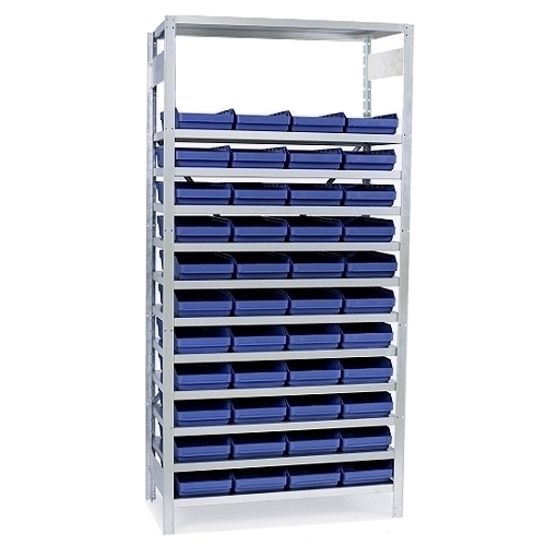 Box shelf is supplied complete with 12 shelves 1000x500 and 44 plastic bins dimensions 500x240x95.