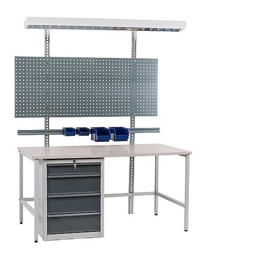 - Packing table set includes a lockable drawer cabinet 550x500x725, perforated posts, perforated wall 2000x600, lighting accessories, 4 plastic boxes 160x103x73, 4 plastic boxes 250x146x128 and bin rail.
