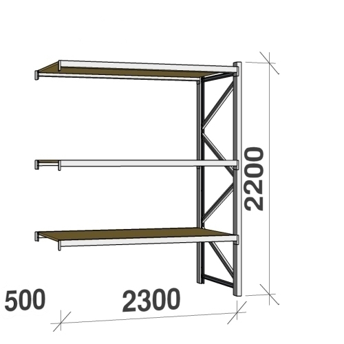 A shelf level consists of two horizontal beams, beam locking clips and a 22 mm chipboard plate.