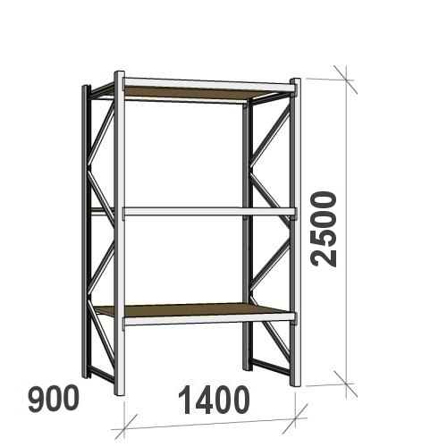 - The kit includes 2 side frames 2500x900 and 3 shelf levels 1400x900 with two horizontal beams and 22 mm chipboard plate.